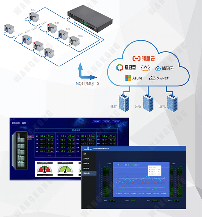 除了支持多种通讯协议接入上位机中心管理软件:GNC协议,ModbusTCP等,作为面向未来物联网应用的物联网产品,WANGKONG 蓄电池监测系统采用的MQTT协议,为阿里、百度、腾讯、Aws、Azure等主流的物联网云服务提供专门适配,数据传输采用TLS安全加密方式,保证数据的机密性和完整性,并且支持同时接入两个云平台,可同时向2个中心发送数据,实现冗余备份系统。