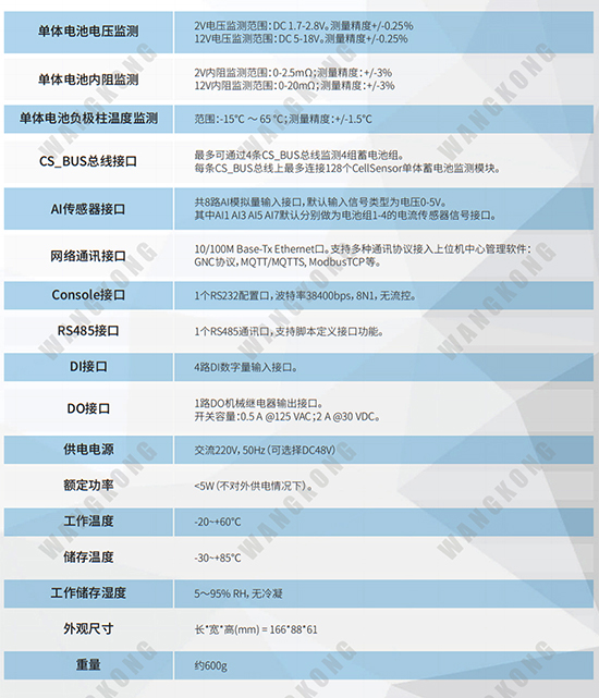 WANGKONG 蓄电池监测系统实时在线监测各单体蓄电池的电压、内阻、负极柱温度和组充放电电流等关键参数,分析判断蓄电池组的运行状态和蓄电池的健康状态SOH。实现单体蓄电池劣化情况的早期诊断和预警,在蓄电池系统异常情况下及时告警。
