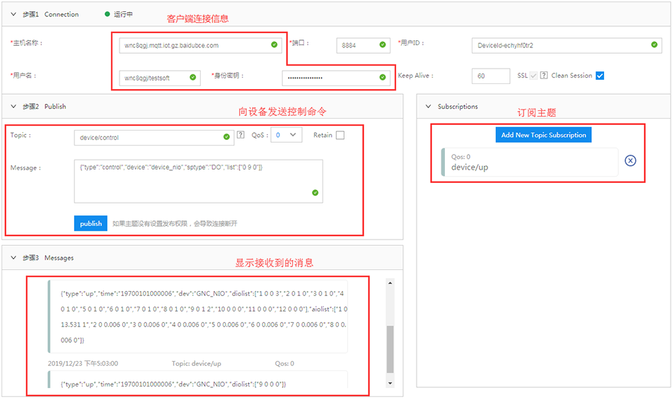 设备接入后,可以在百度天工控制台通过“连接测试”功能模拟MQTT客户端,验证物接入的 连接情况并查看流转消息。