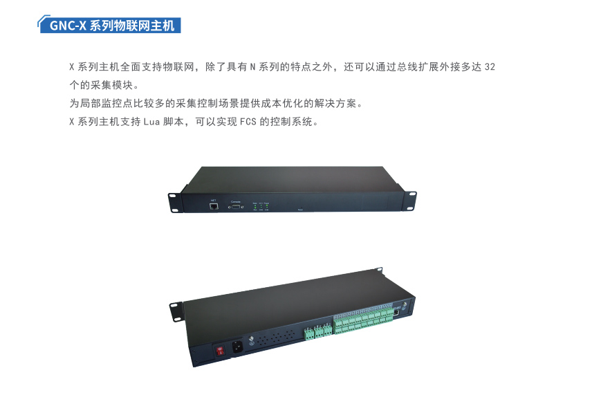X系列物联网主机全面支持物联网,除了具有N系列的特点之外,还可以通过总线扩展外接多达32个的采集模块。