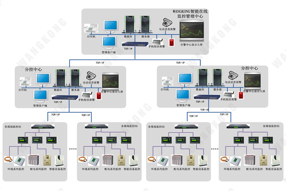 WANGKONG智能在线监控综合管理系统是大规模分布式远程数据采集分析系统;能对分布广泛分散的众多的基站,机房,尤其是那些无人值守的通信基站和机房的设备、环境、安全进行全天候无人监测,各个众多分散基站和机房可采用多种通讯方式(有线、5G等)与管理中心进行通讯,并将数据传输到WANGKONG智能在线监控系统数据库中,用于统计分析、处理和多维度展示;WANGKONG智能在线综合管理系统具备帮助用户从不同角度分析数据、缩小故障答案的范围、展示数据的不同影响,把显示结果的形象化和使用过程的互动性,便于用户及时捕捉其关注的数据信息,给问题决策提供科学依据。