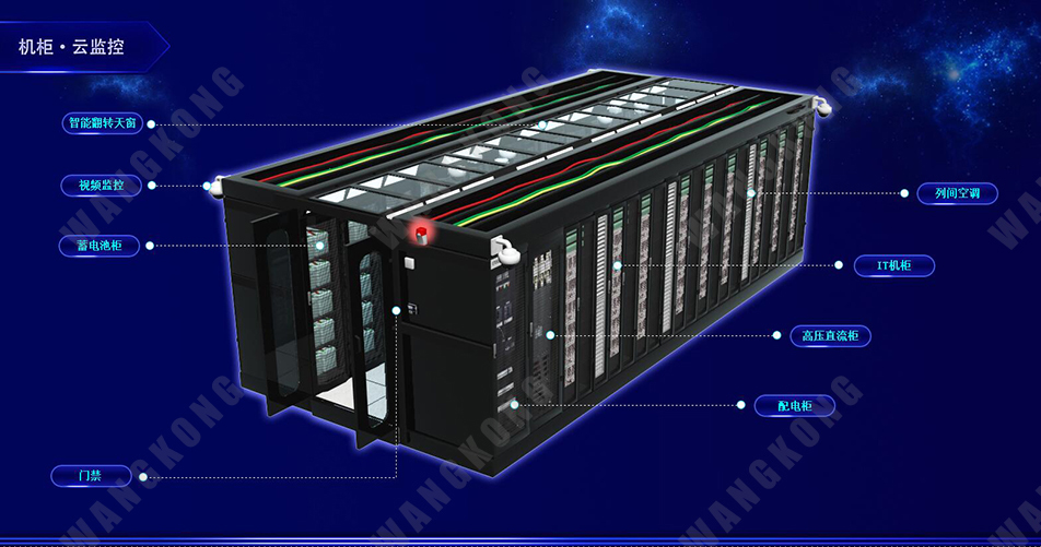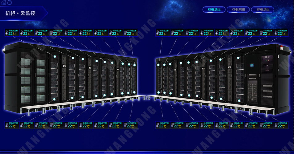 WANGKONG模块化机房环境监控系统能实现对单/双排,密闭/开放冷热通道的通道级、机柜级的环境、配电、电池组、消防、视频、安防、天窗等设备的数据采集、存储、分析、告警、展示等功能。系统可以独立运行,同时能提供外部接口,也可以通过IP网络集中上传监控管理中心实现多维度展示。